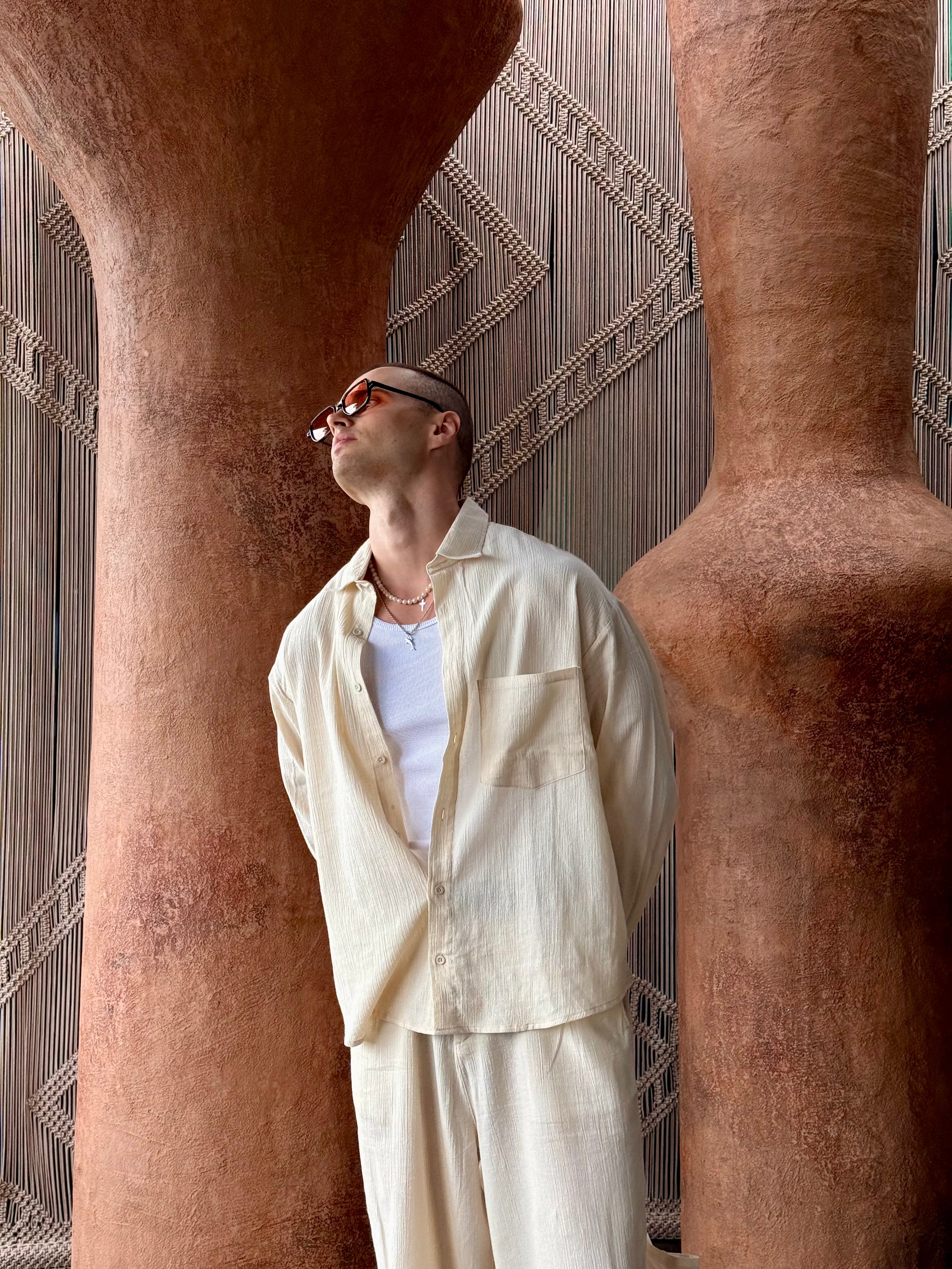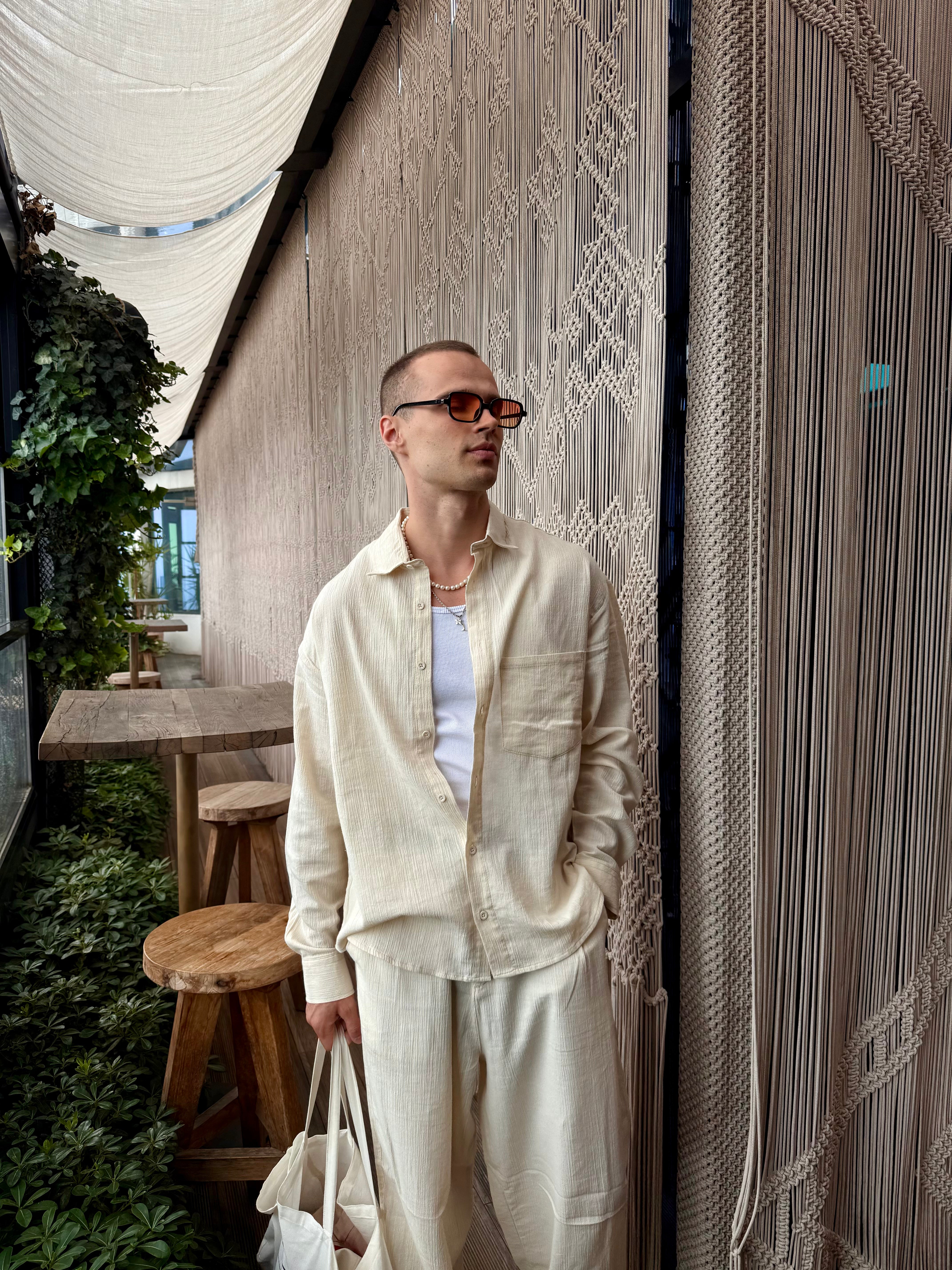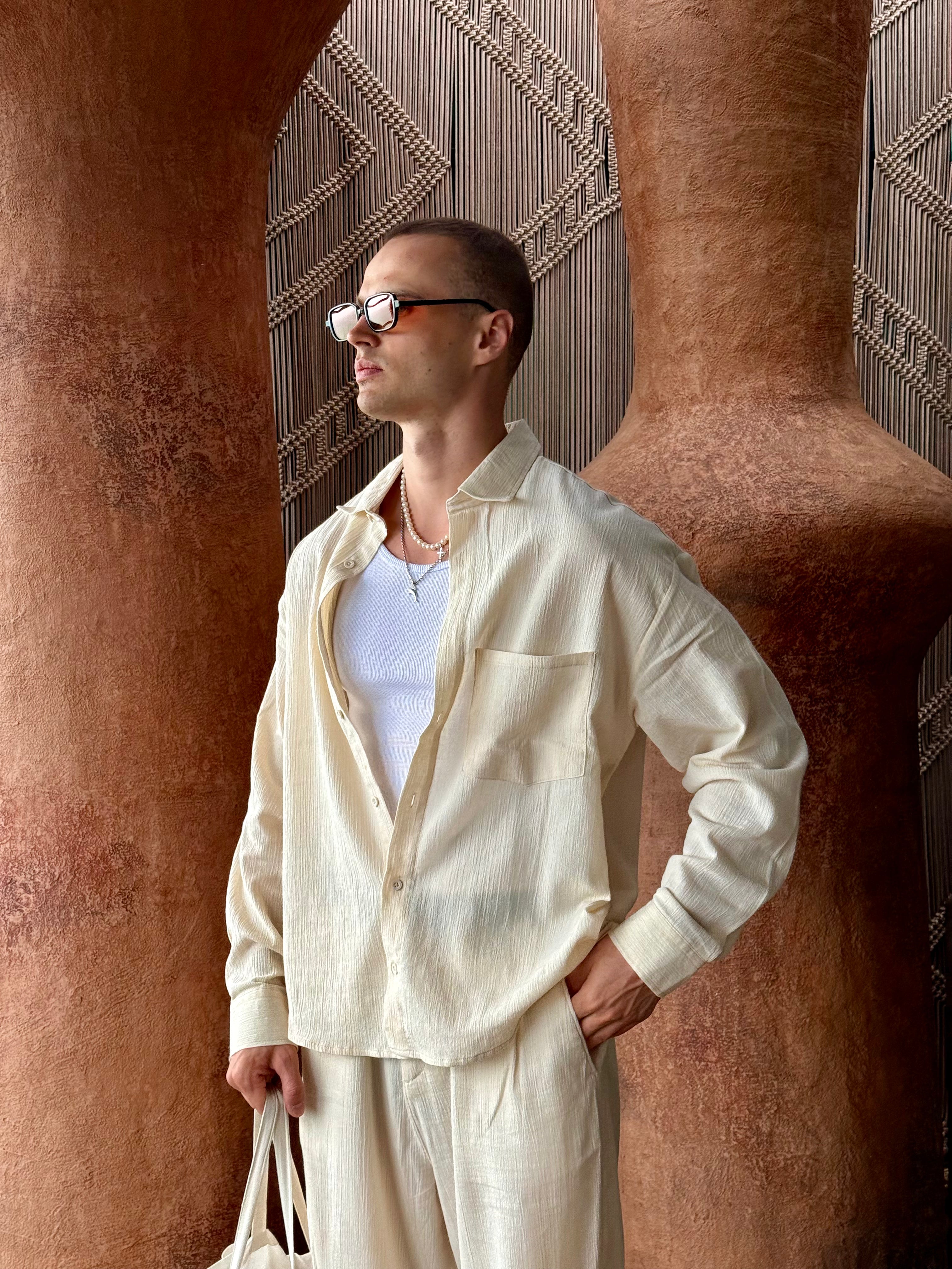 Men's crinkled linen shirt — the perfect combination of comfort, natural lightness, and minimalist style. Made from 100% linen, the natural fabric breathes and keeps you cool on hot days, while the crinkled texture adds character and makes the piece practical since it doesn’t require ironing.