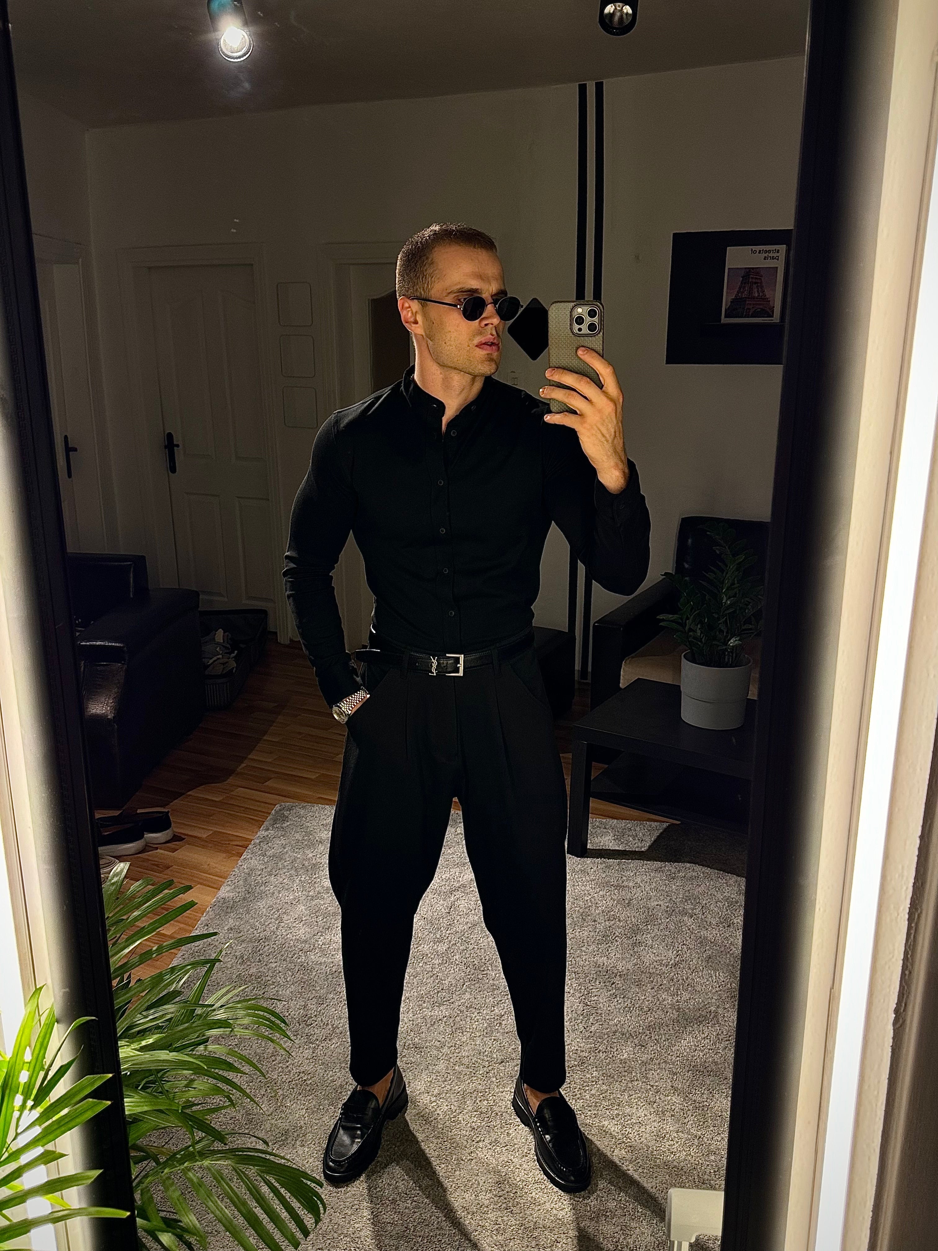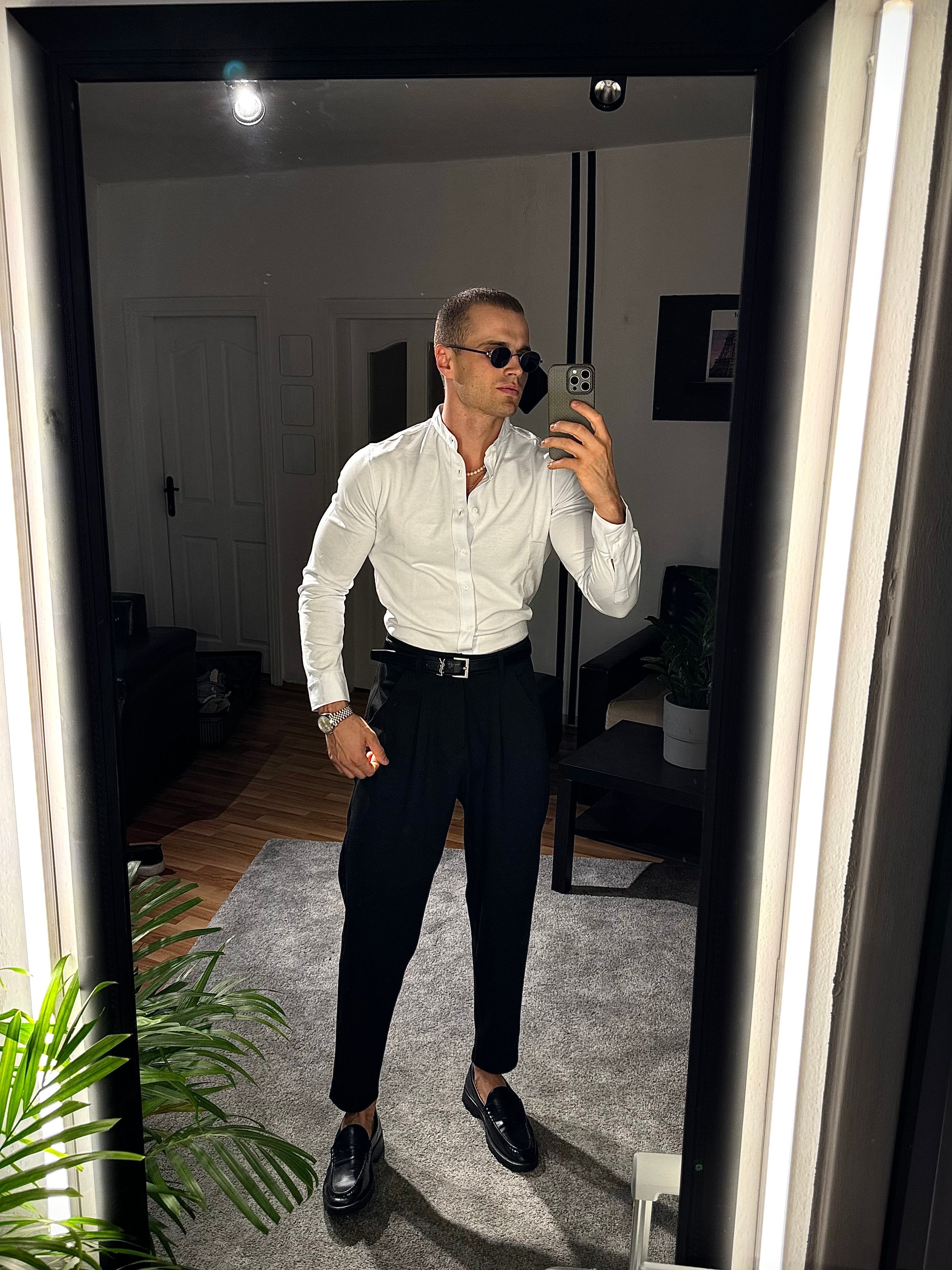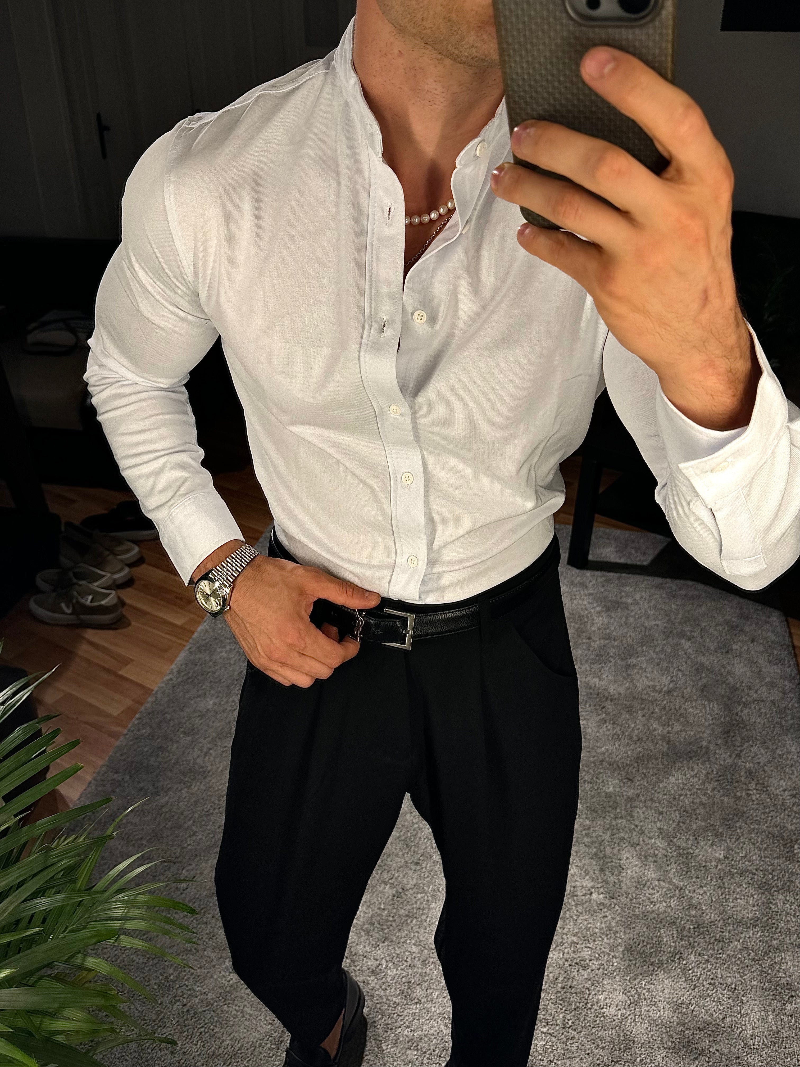 The basic stand collar shirt is a foundation for both business and casual looks.