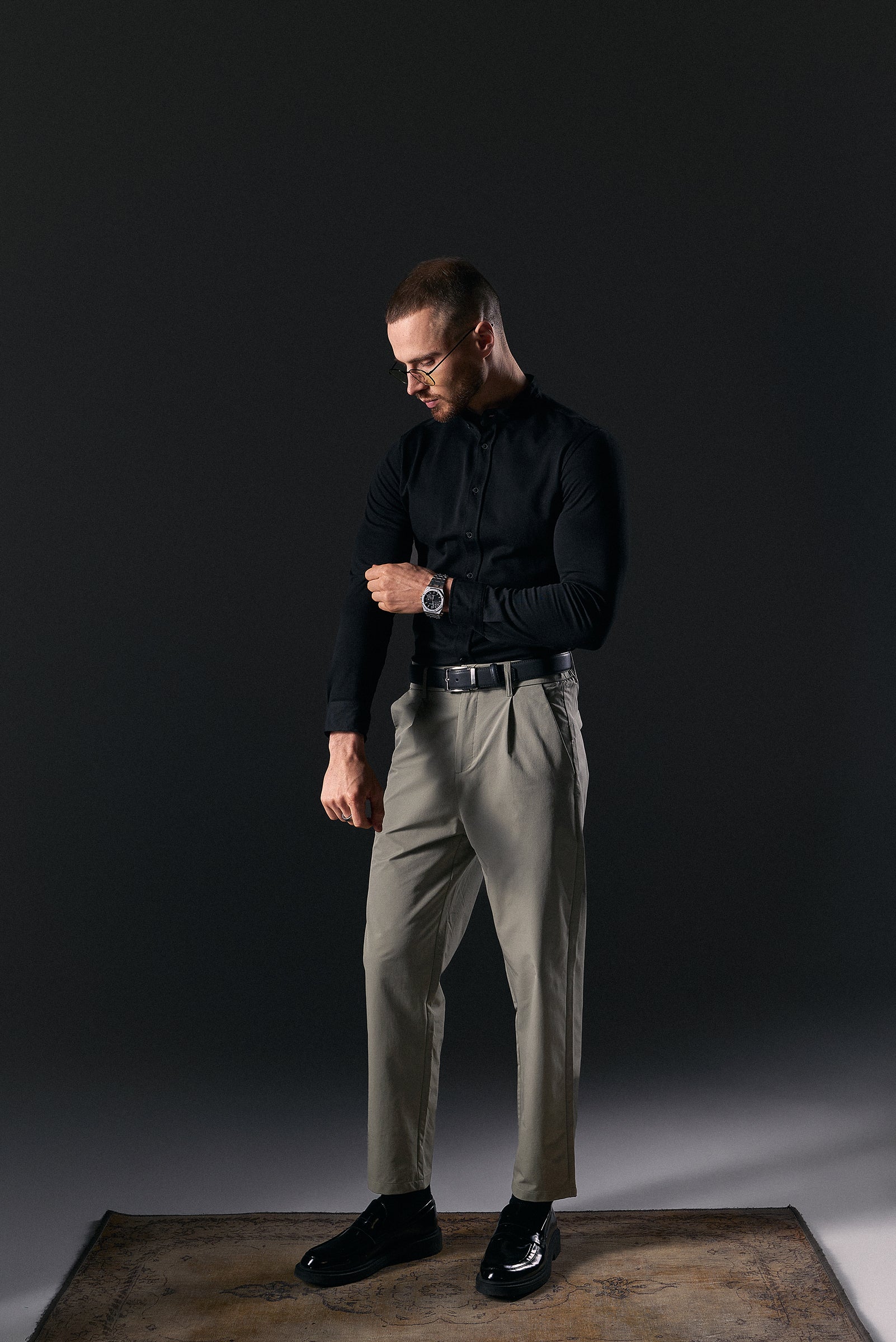 The basic stand collar shirt is a foundation for both business and casual looks.