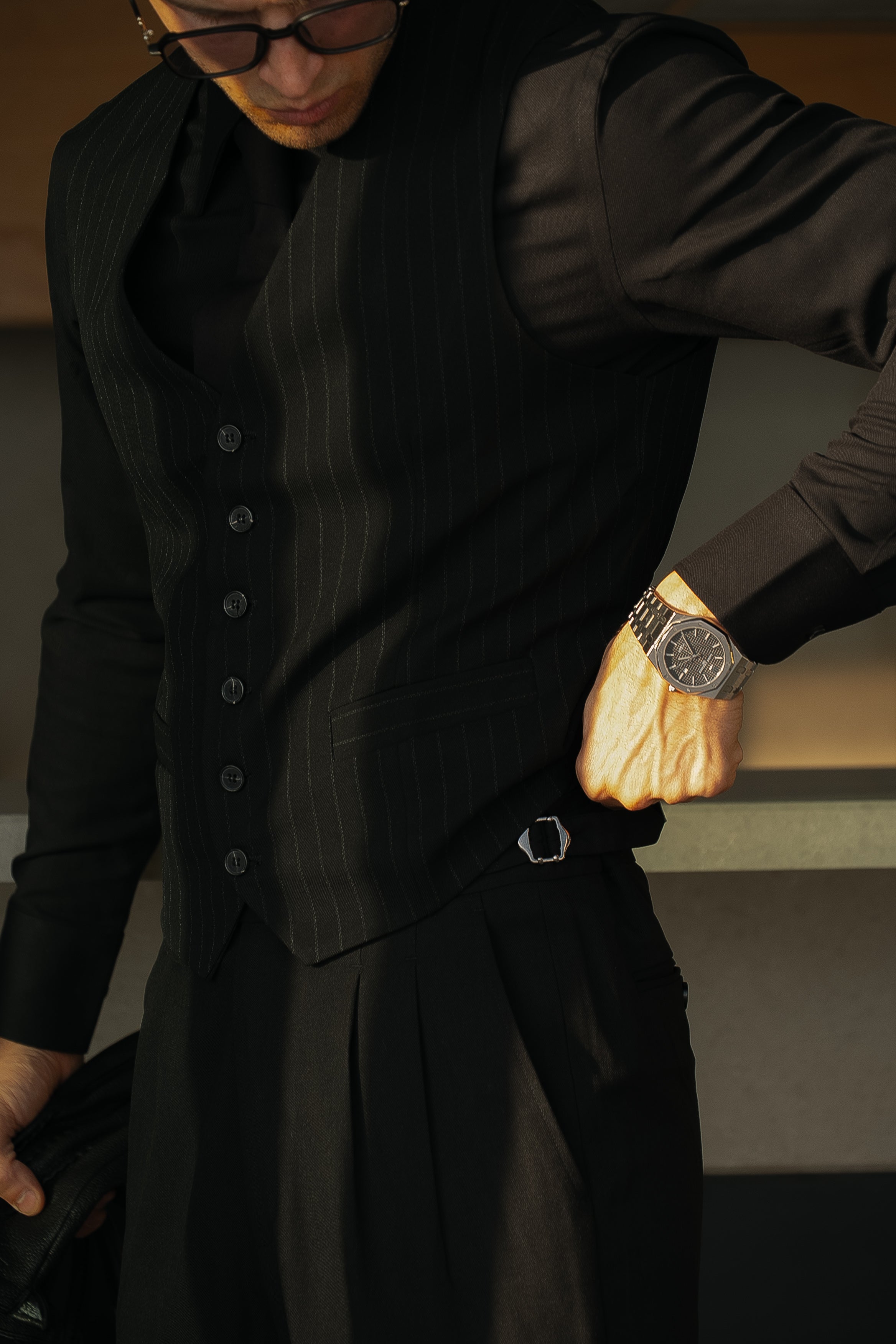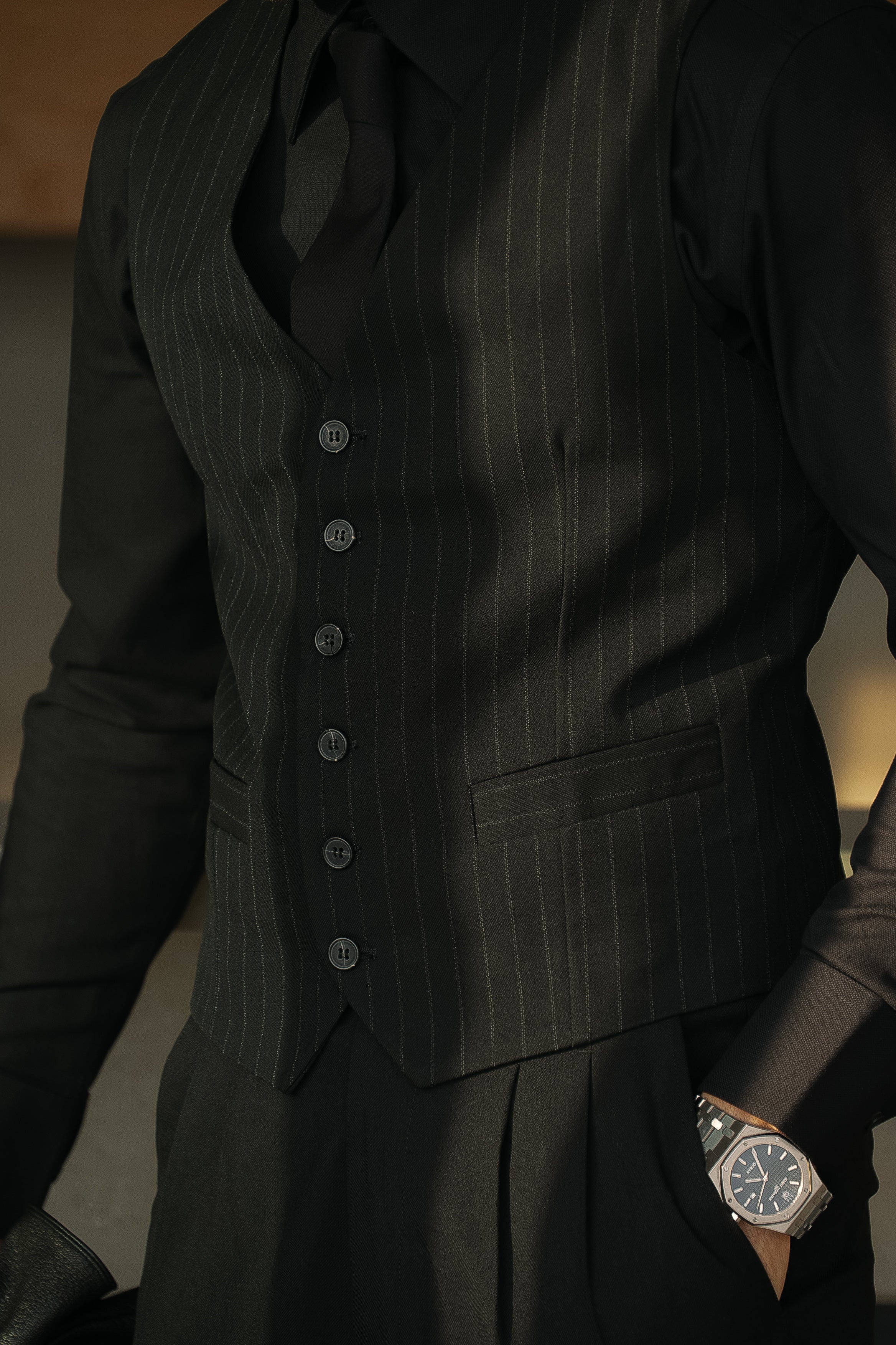 A minimalist vest with a structured cut that adds elegance and definition to any outfit. Perfect for both classic sets and modern layered looks. It appears understated while still highlighting style and character.