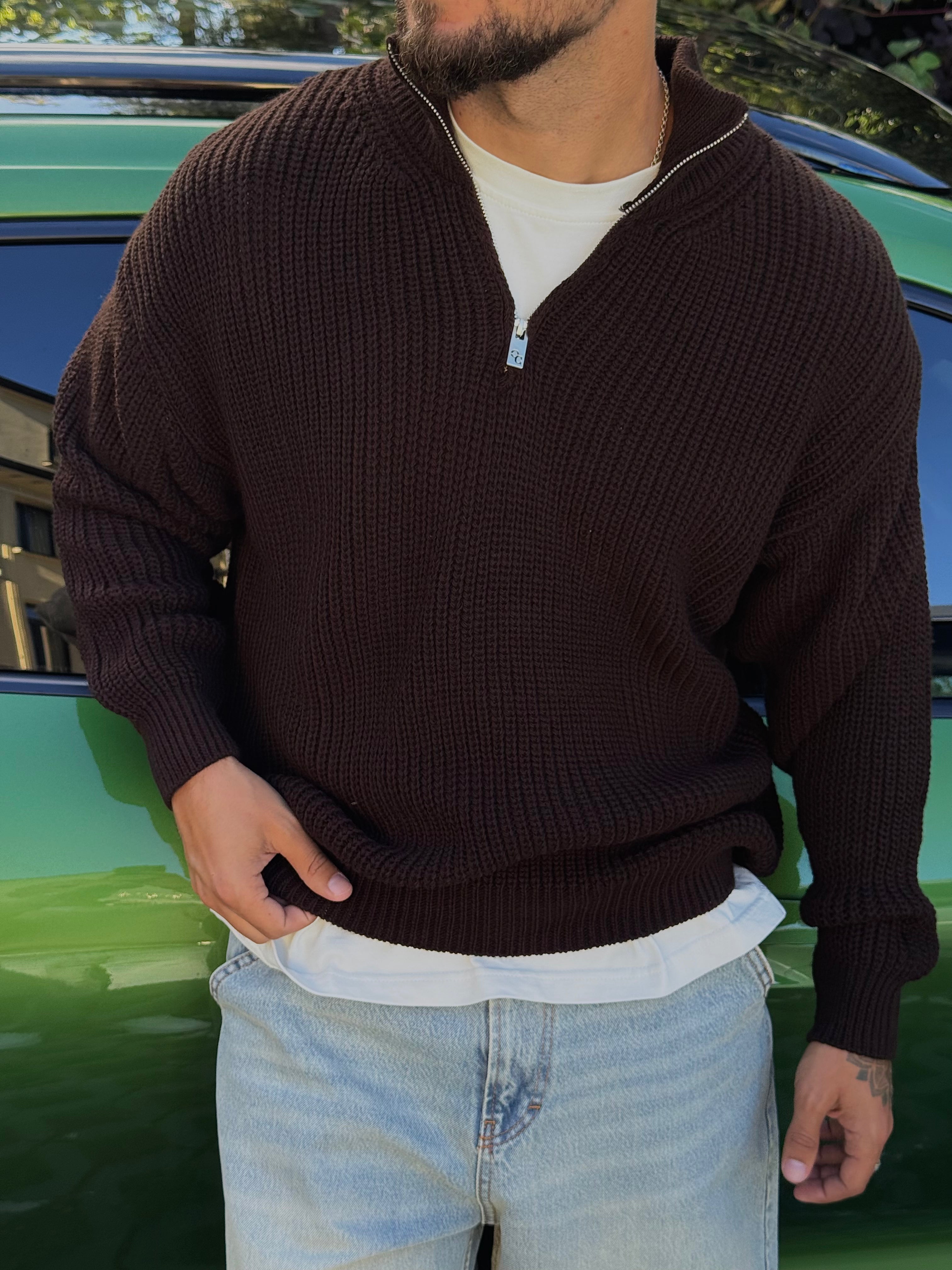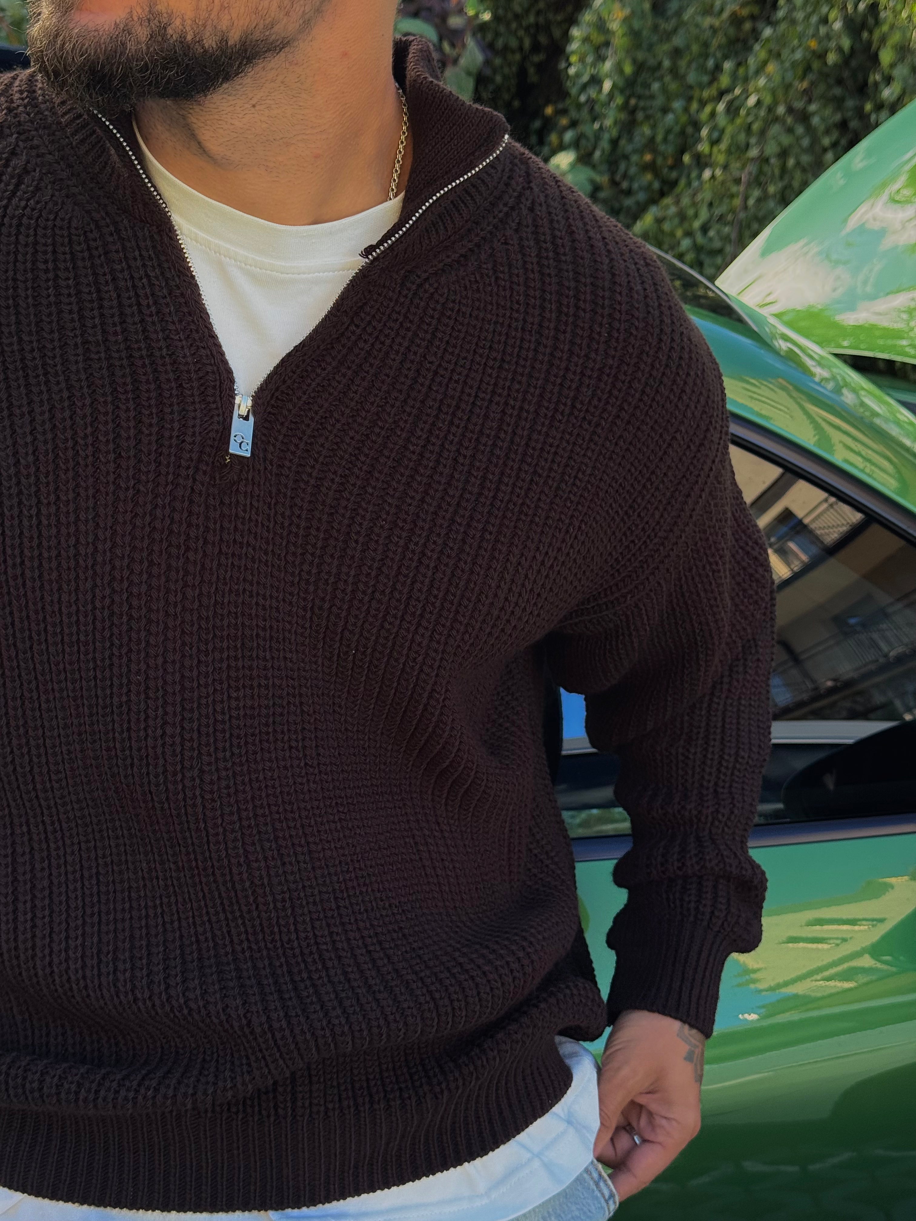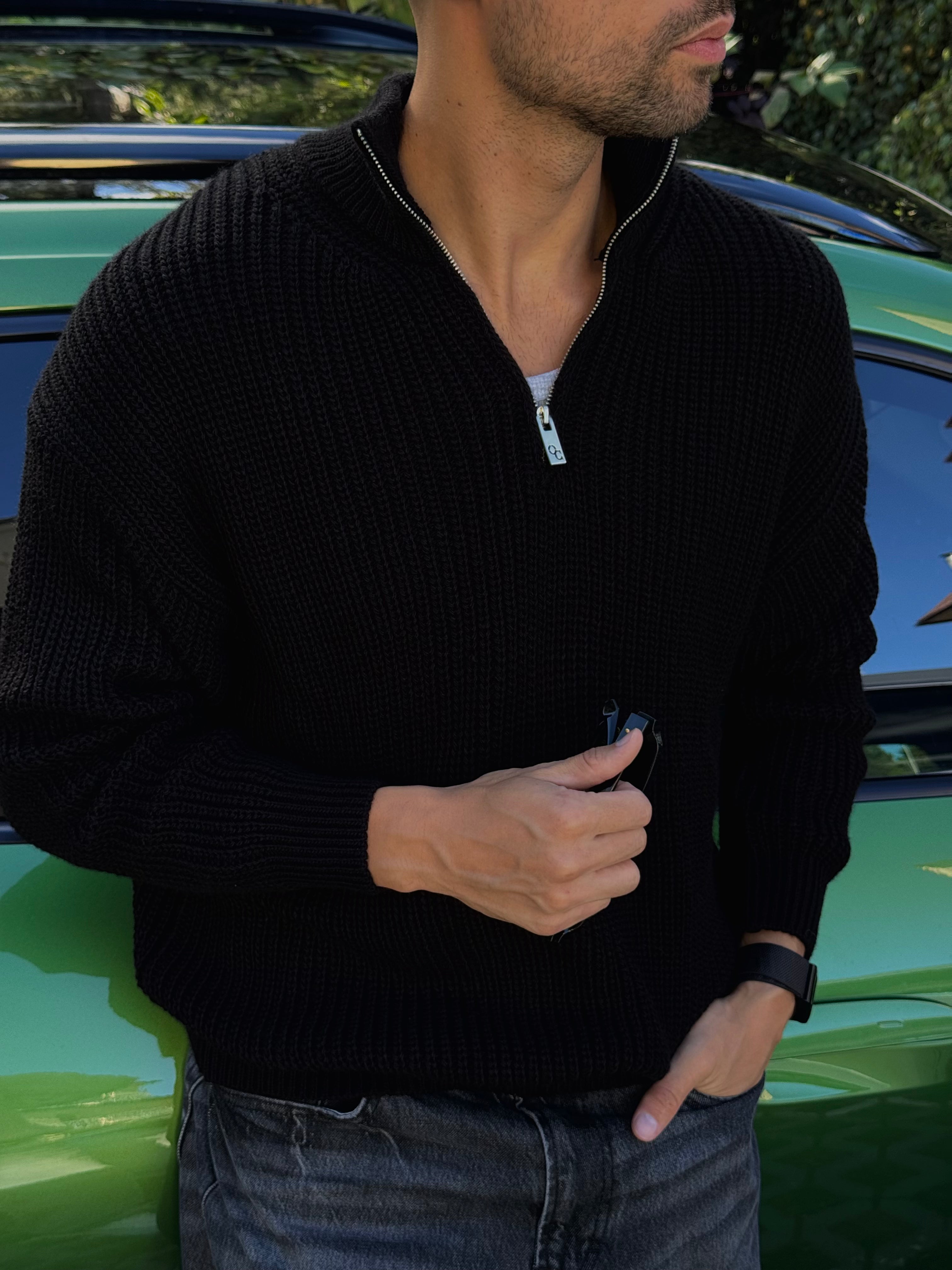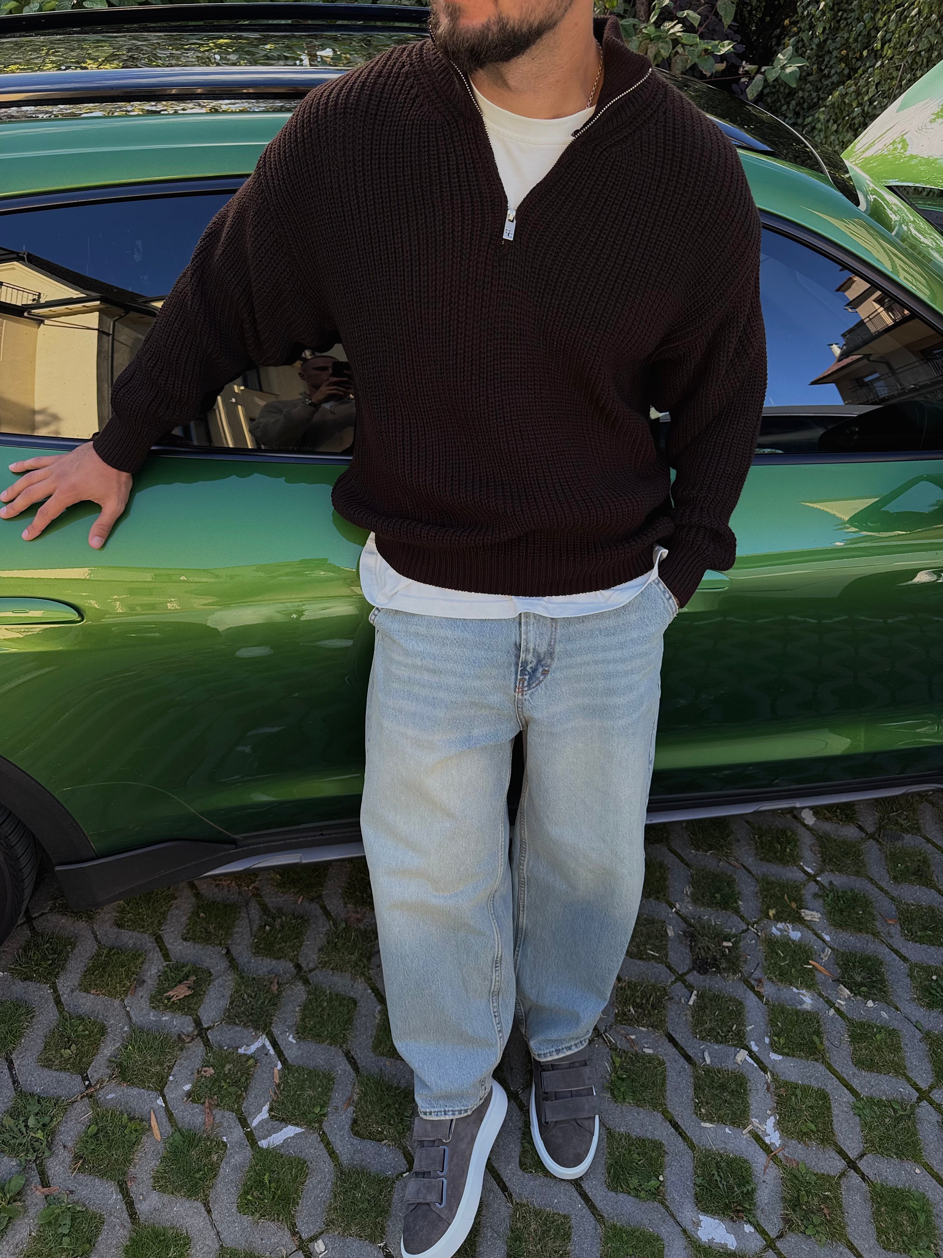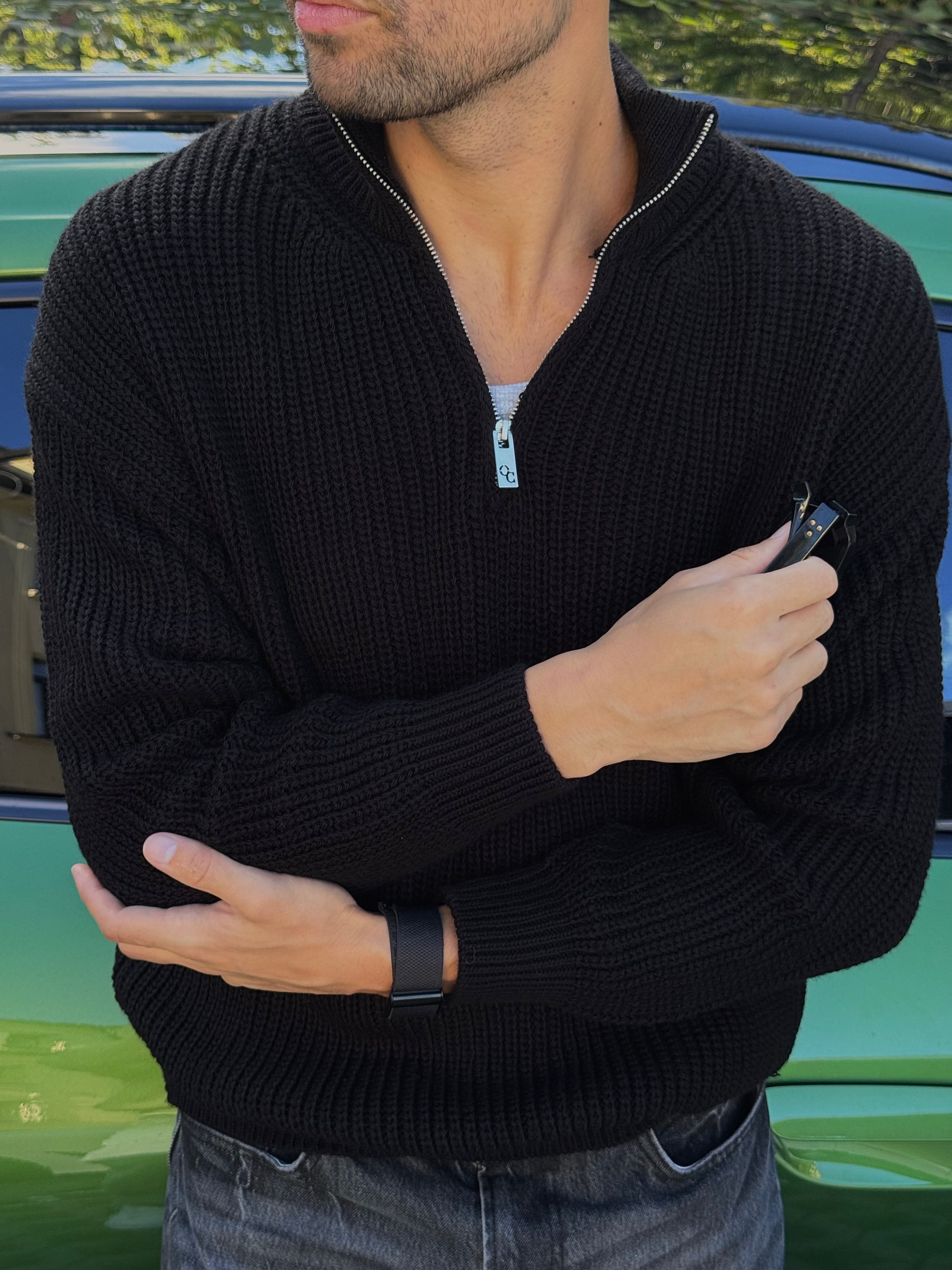 Практичний в'язаний джемпер з високим коміром та блискавкою, що ідеально підкреслює мужність та стиль.